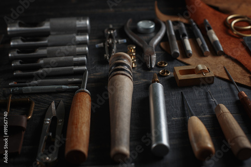 Set of leather craft tools on wooden background. Workplace for shoemaker. Piece of hide and working handmade tools on a work table