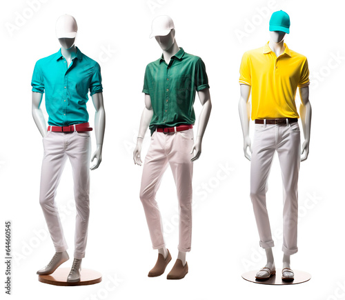 Set of male mannequin wearing colorful t-shirts in casual elegant sport style on isolated white background
