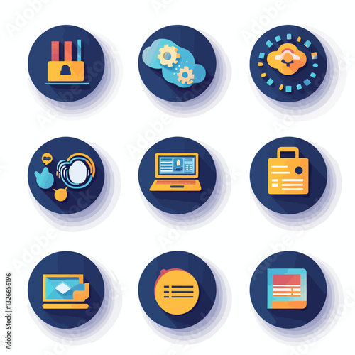 icon, technology, business, datum, cloud, networking, laptop, communication, software, application, cyberspace, database, digital, information, connection, online, network, system, development, design, modern, flat, illustration, graphic, vector, interface, symbol, set, tech, data transfer, synchronization, storage, device, information technology, blue, orange, white, abstract, circle, round