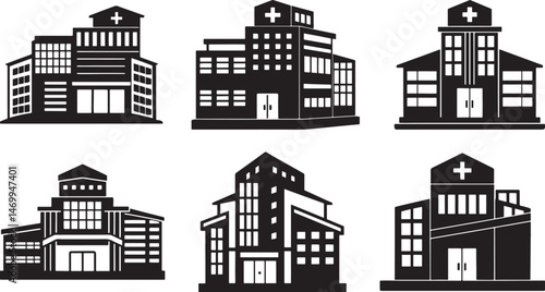 set of modern hospital building silhouette, black and white silhouette, vector and illustration