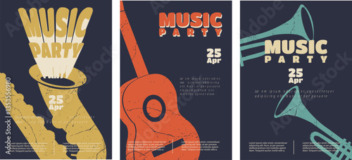 Set of modern posters for retro style music party with live music. Concept of musical lifestyle, music parties,creativity, inspiration, imagination, imagination, advertising.