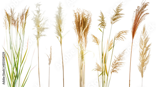 Set of ornamental grass flowers including pampas, fountain grass, and feather reed grass, isolated on transparent background