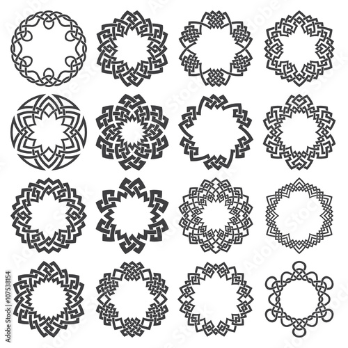 Set of ornamental round frames. Sixteen hexagonal decorative elements with stripes braiding for your logo or monogram design. Creative mandalas collection