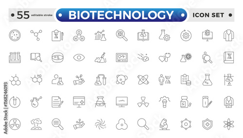 Set of outline icons related to biotechnology, biochemistry, farming, science. Lab and science line icon set. Laboratory equipment icons. Flask, microscope, syringe. Editable stroke outline icon.