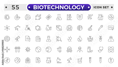 Set of outline icons related to biotechnology, biochemistry, farming, science. Lab and science line icon set. Laboratory equipment icons. Flask, microscope, syringe, pipette, petri dish.