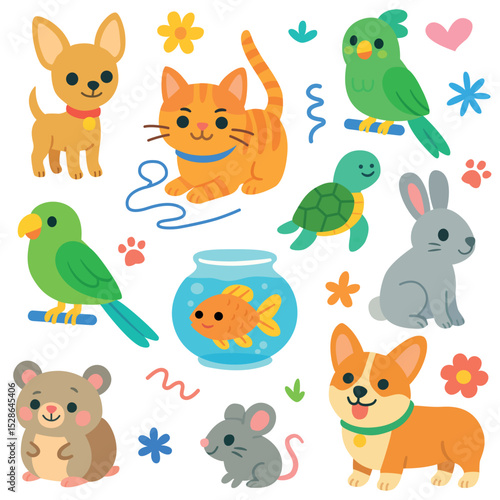 Set of pet illustration, of dogs, birds, fish, and other home animals