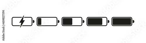 Set of phone battery charging icons. A comprehensive collection of icons representing different battery charging levels for mobile phones. These icons visually depict battery charging statuses.