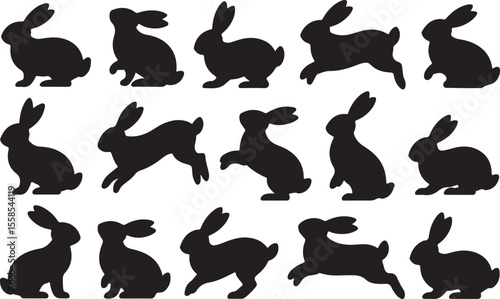 Set of rabbits silhouette in different poses. Hand drawn black silhouettes of easter bunnies isolated on white background. Vector illustration of decorative elements for design decor