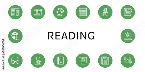 Set of reading icons such as Article, Book, Desk lamp, Student, Dictionary, Glasses, Newspaper, Encyclopedia , reading
