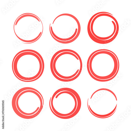 Set of red circle marker elements, hand drawn style, isolated on white.