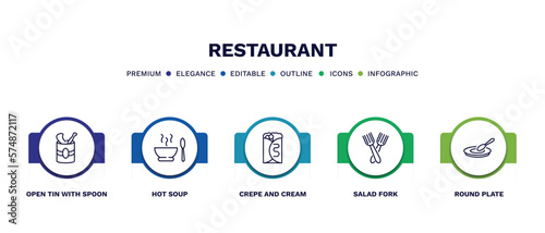 set of restaurant thin line icons. restaurant outline icons with infographic template. linear icons such as open tin with spoon, hot soup, crepe and cream, salad fork, round plate vector.