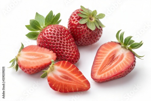 Set of ripe whole and sliced strawberries. (Strawberry)