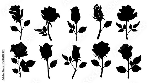 set of rose with leaves silhouette vector on white background