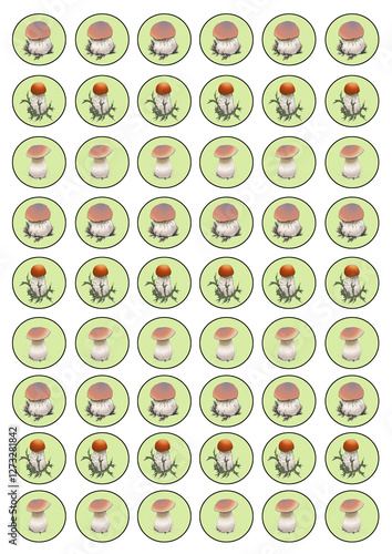 Set of round game tokens. Cartoon natural red hat mushrooms. Isolated images in the circles. Creative digital geometric background. Symbol for infographics. Abstract wallpaper. Flat fractal pattern.