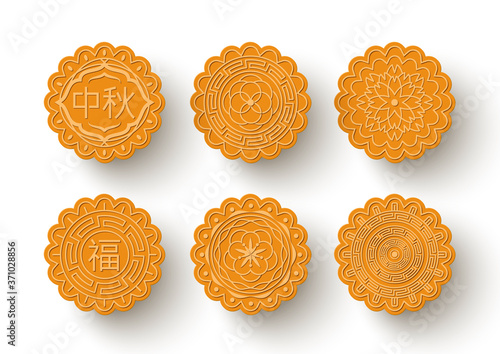 Set of round ornamental cookies, mooncakes for Mid Autumn festival. Vector illustration. Chinese translation is blessing and Mid Autumn. Floral and asian patterns.