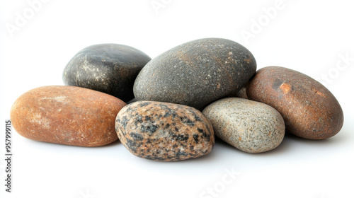 Set of sea stones isolated on a white background, including pebbles from the beach and natural minerals, presented in a high-quality photo.