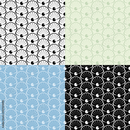 set of seamless patterns with abstract sea shining pearl icon in open shell. Ornament for decoration and printing on fabric. Design element. Vector