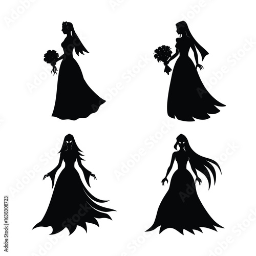 dress, fashion, wedding, silhouette, vector, bride, woman, illustration, art, beauty, clothing, style, design, set, lady, clothes, people, cartoon, dance, model, gown, black, vintage, collection, couple
