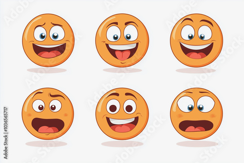 set of six cartoon faces with different expressions. The first one is smiling, the second one is laughing, the third one is crying, the fourth one is angry, the fifth one is surprised