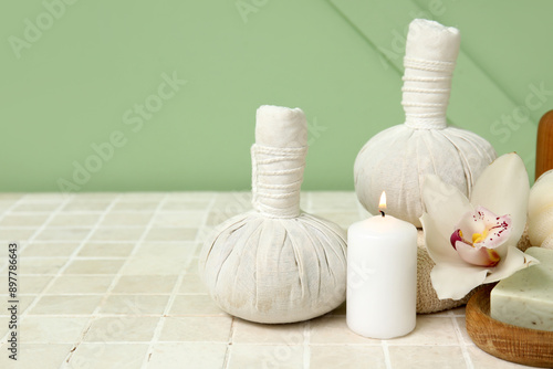 Set of spa supplies with herbal bags, soap bar, orchid flower and burning candle on beige tile table