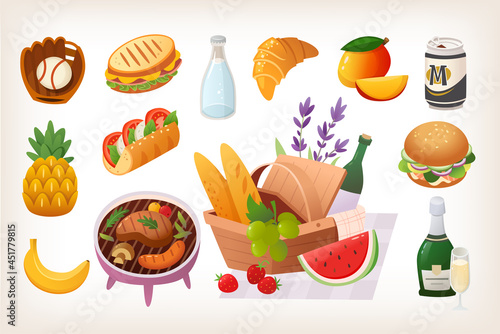 fruit, healthy, glove, party, snack, bread, blanket, hamper, flower, organic, isolated, water, baseball, french, sparkling, croissant, mango, canned, beer, burger, pineapple, banana, vegetable, steak, sausage, meat, grilled, dessert, strawberry, grape, sandwich, baguette, watermelon, bottle, glasses, icon, champaign, wine, basket, collection, element, item, food, summer, illustration, sticker, image, vector, picnic