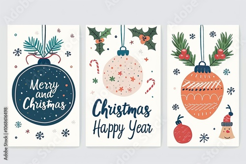 Set of three Christmas cards, clean "Merry Christmas and Happy New Year" text, traditional festive colors, subtle decorations