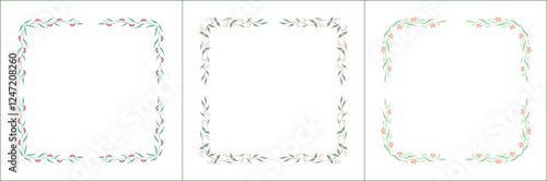 Set of three elegant green vegetal ornamental frames with small pink flowers, decorative border. Isolated vector illustration. Floral frame.