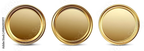 Set of three golden award badges with smooth and shiny surfaces for recognition or achievement design, perfect for a prestigious contest or event celebration.