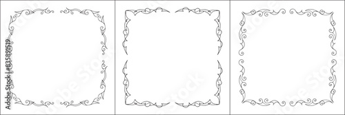 Set of three thin elegant black and white ornamental frame, decorative border, corners for greeting cards, banners, business cards, invitations, menus. Isolated vector illustration.