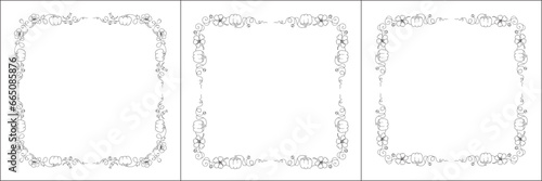 Set of three vector frames with pumpkins and Nasturtium flowers. Elegant black and white monochrome ornamental corners. Vector frame for all sizes and formats. Isolated vector illustration.