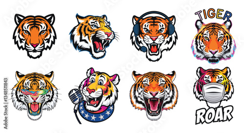 tiger, illustration, mascot, tattoo, art, head, sticker, face, wildlife, logotype, t-shirt, graphic, silhouette, icon, set, collection, artwork, clip art, wildcat, safari, striped, danger, drawing, bengal tiger, signs, jungle, creative, nature, modern, artistic, digital artwork, colourful, style, polygonal, shape, poster, textile, greeting, hand-drawn, design, print, cat, social
