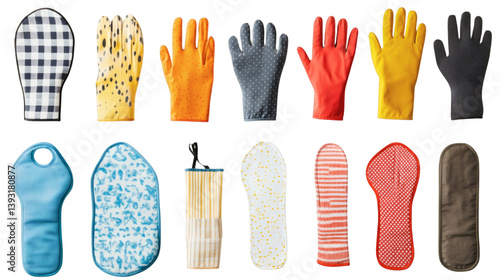 Set of various stylish kitchen protective oven gloves isolated on white background