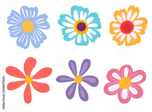 flower, vector, pattern, flower, floral, design, pink, nature, spring, illustration, summer, set, decoration, icon, blossom, colours, daisy, plant, art, bloom, element, shape, ornament, cute, colourful, vibrant, playful, funny, modern, graphic elements, blue, white, red, yellow, orange, purple