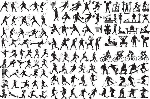 silhouette, vector, sport, icon, illustration, people, set, basketball, icon, sport, athlete, bodybuilder, fitness, football, karate, marathon, bodybuilding, tennis, runner, cross-country skiing, tennis player, bicycle, mountain bike, ski, skier, football player, ball, skate, skateboarder, snowboarder, gymnastics, gym, bicyclist, bicycle racing, running, exercise, art, black, soccer, competition, woman
