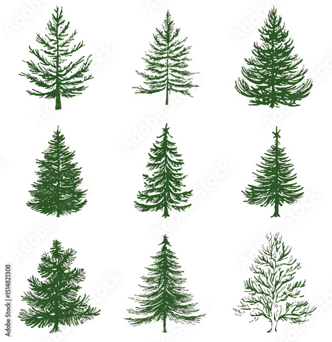 set of vibrant green Christmas tree illustrations, evoking cheerful and festive holiday spirit, perfect for spreading joy and seasonal greetings