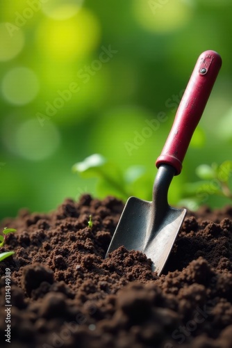 Set of vintage garden tools plunged into fertile soil , brown, fork, handle
