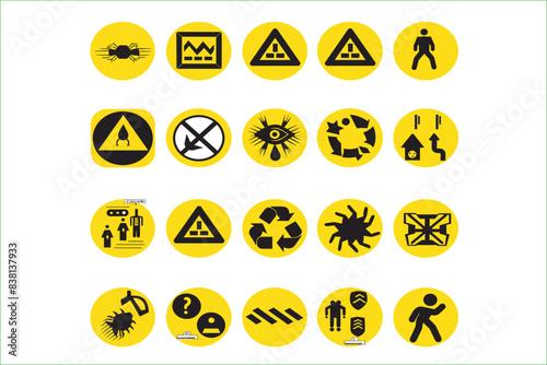 Set of Warning Hazard Signs circle yellow sign, vector icon isolated on white background. Danger warning set circle and triangle yellow sign. Danger warning signs, threat icons.