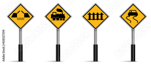 gate, slippery, left, right, pedestrian, square, information, highway, template, transport, city, law, driver, traffic sign, street, standard, prohibition, board, signal, travel, lane, background, caution, icon, stop, safety, traffic, warning, road, signs, transportation, way, direction, car, vehicle, speed, danger, arrow, illustration, set, vector, yellow, isolated, symbol, attention, cross, concept