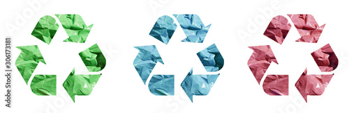 Set of waste recycle emblem. Green plastic bag texture background. Isolation on white. Stop garbage. Reuse materials. Save planet.