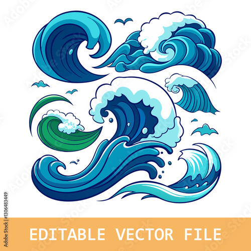 set of Water wave, cartoon style vector illustration set of water waves with blue color and transparente background