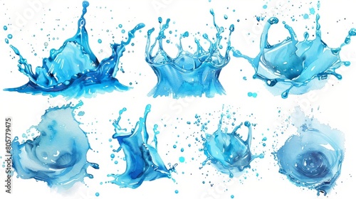 Set of watercolor blue and cyan water splashes, drops and. spots hyper realistic