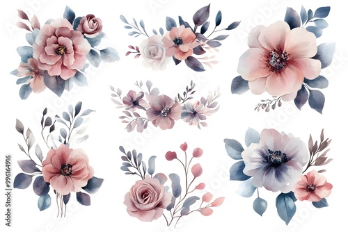 Set of watercolor floral bouquet illustration collection, isolated on a white background.