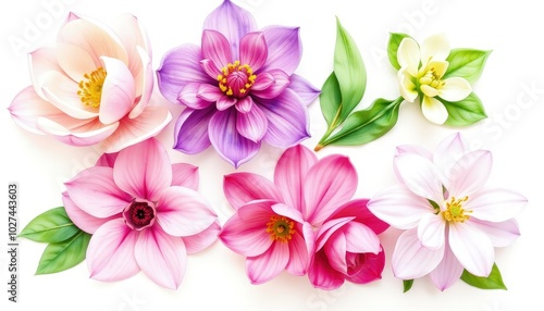 Set of watercolor flowers: magnolia, camellia, amaryllis, hyacinth, ranunculus on white background AI Generate