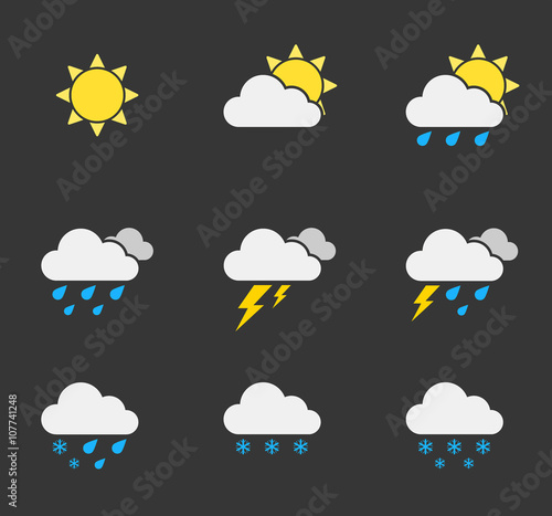 sun, weather, rain, lightning, climate, symbol, signs, summer, winter, cloudy, illustration, season, meteorology, snowflake, snow, heat, storm, vector, cold, cloud, nature, element, set, design, temperature, icon, blue, water, forecast, graphic, sunny, element, yellow, ray, sky, thunderstorm, hot, clear, dripped, thunder, cloud, white, bright, style, grey