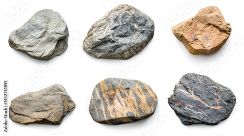 Set of weathered rocks with visible cracks on beach sand on white background.