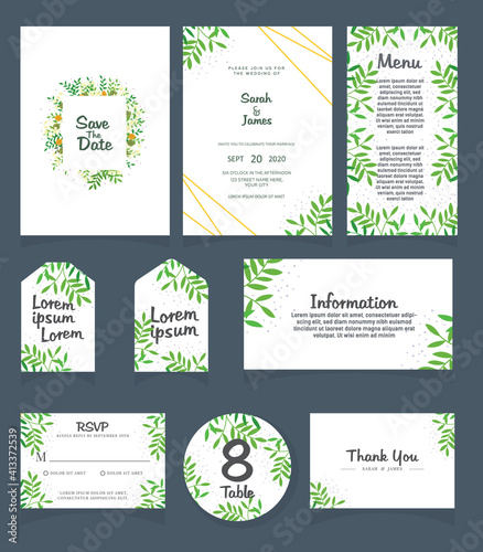 Set of Wedding invitation Vector illustration. card template. Wedding invitation, thank you, save the date, menu, information, RSVP, label, table number and place card design.