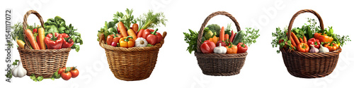 Set of wicker basket filled with assorted fresh vegetables and herbs, rustic style, isolated on transparent background.