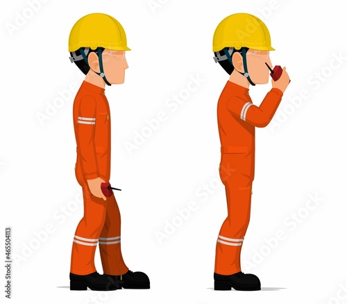 men at work, walkie-talkie, radio, communication, site, racked, talk, report, use, worked, message, industrial, industry, manufacturing, construction, crude oil, petrochemical, engineer, engineering, factory, heavy duty, vector, illustration, cartoon, isolate, isolated, transparent, orange, jumpsuit, white, background, helmet, man, people, person, staff, side, guy, technician, maintenance, professional, oil, gas, offshore, foreman, patrol, inspector, mechanical