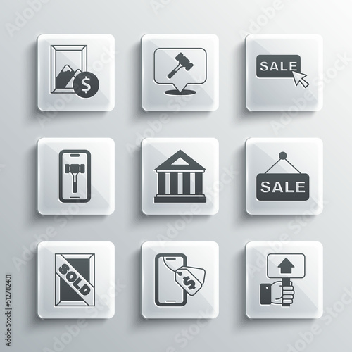 Set Online auction, Hand holding paddle, Price tag with Sale, Museum building, Auction painting sold, and icon. Vector