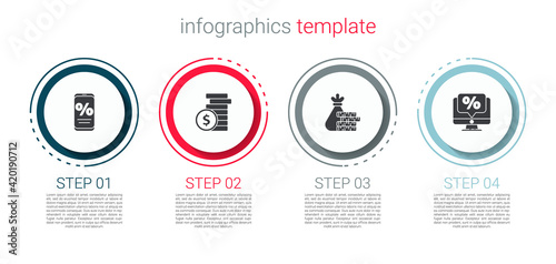 Set Percent discount and mobile, Coin money with dollar, Money bag coin and monitor. Business infographic template. Vector